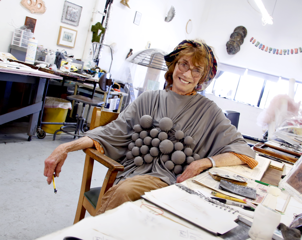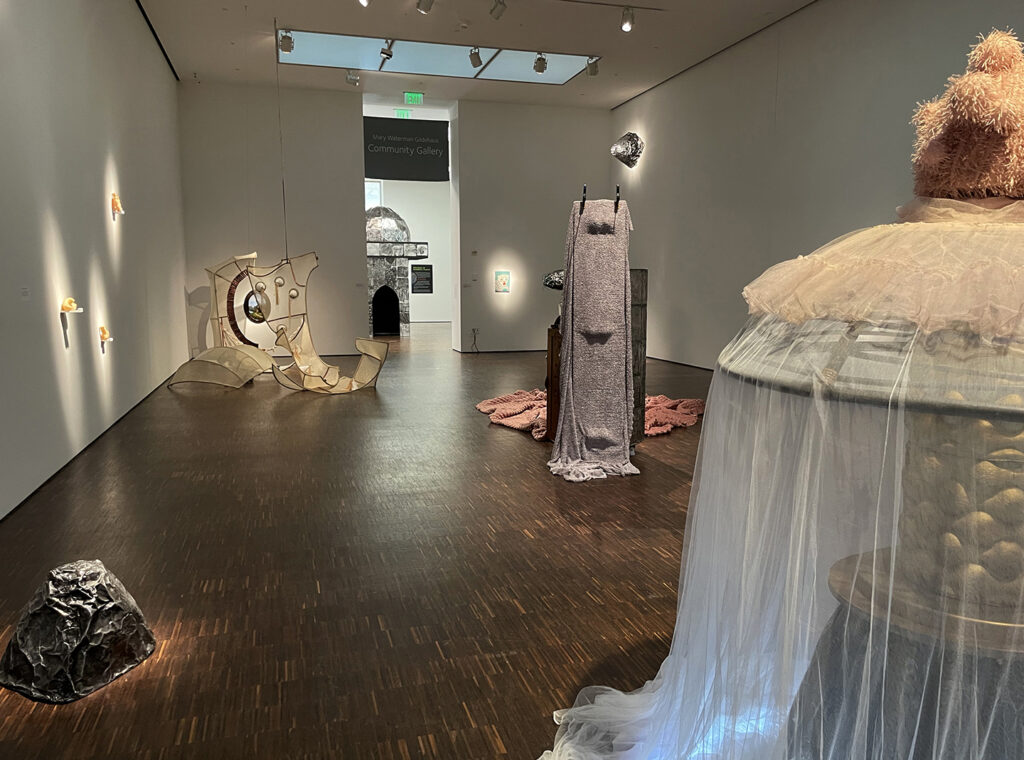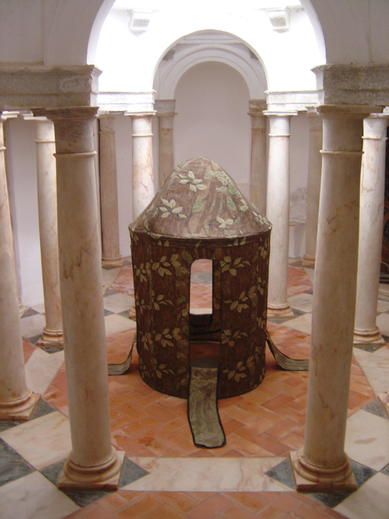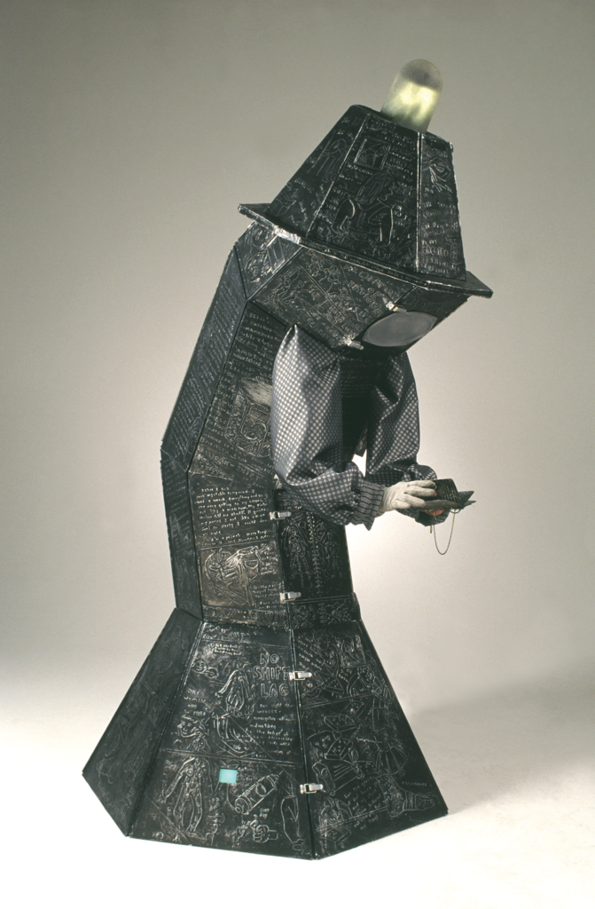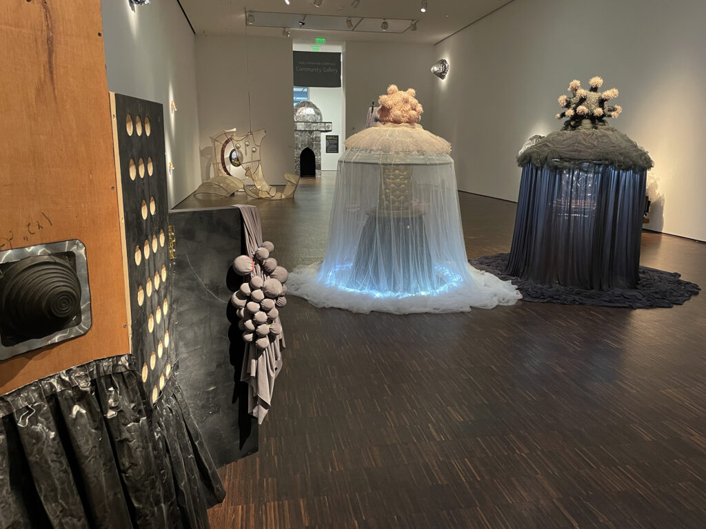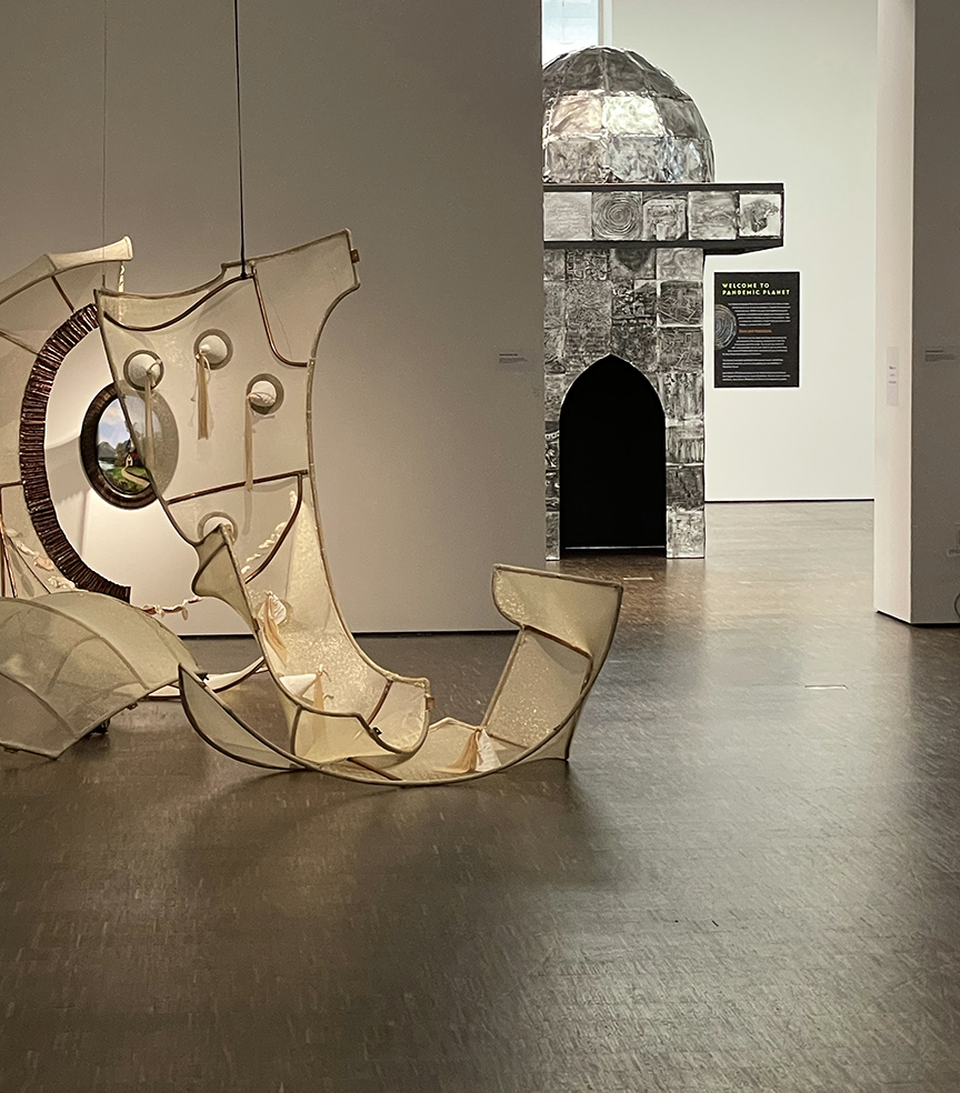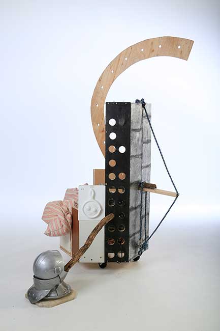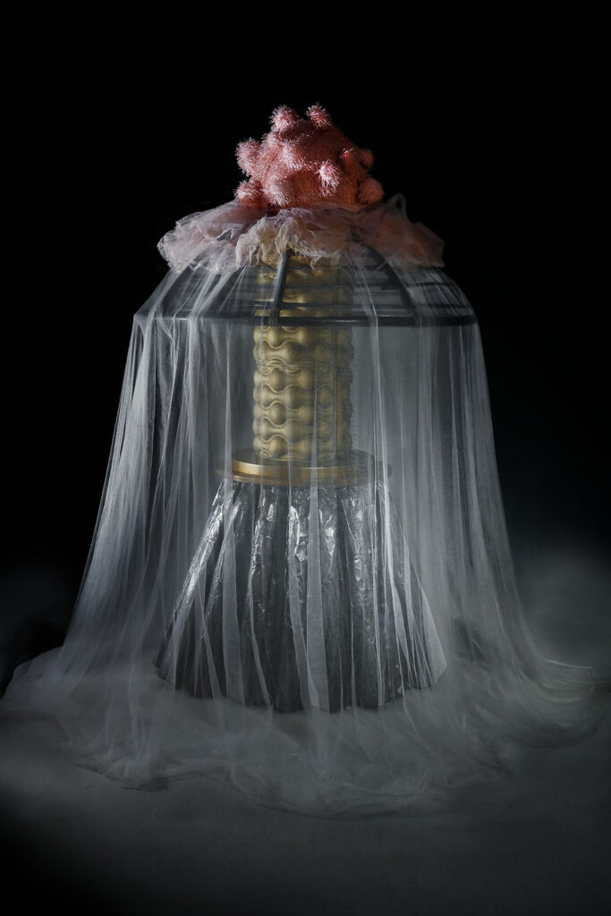 Breakfast on Pluto, 2019-20, repurposed objects, fabric, embossed aluminum, rotating platform, 6.5 ft.h x 5ft.d x 5ft.w