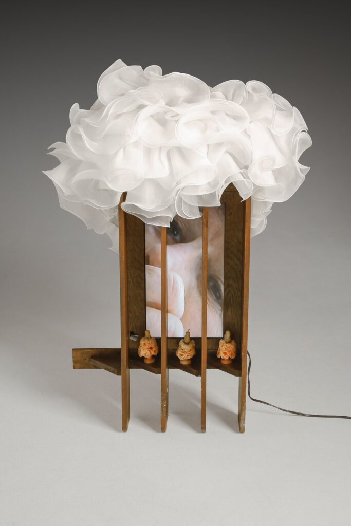 Fatigue, 2019, repurposed wood shelves, net skirt, and 3-minute loop video (2004), video monitor 48”h x 30”w x 5”d