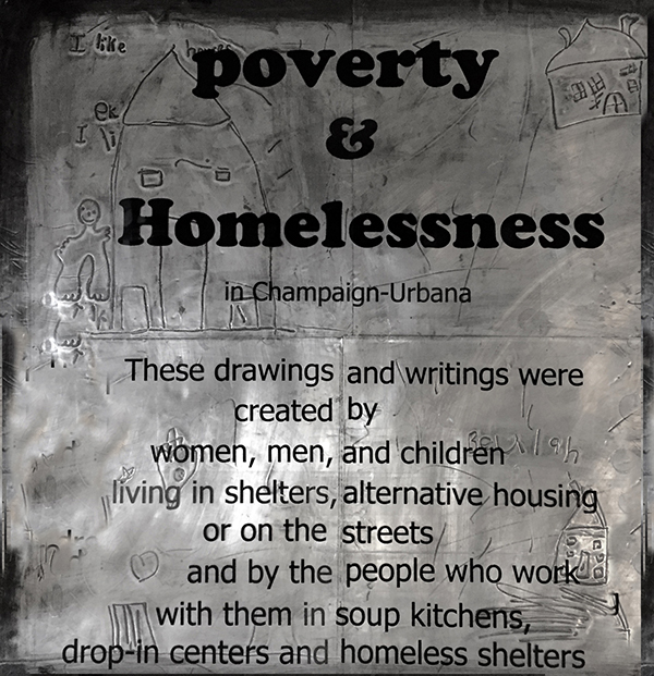 Bed Shoe Home: Poverty and Homelessness in Champaign-Urbana, detail of walk-in book, title page panel, embossed aluminum, transparency, 12′ x 12′, 2017.