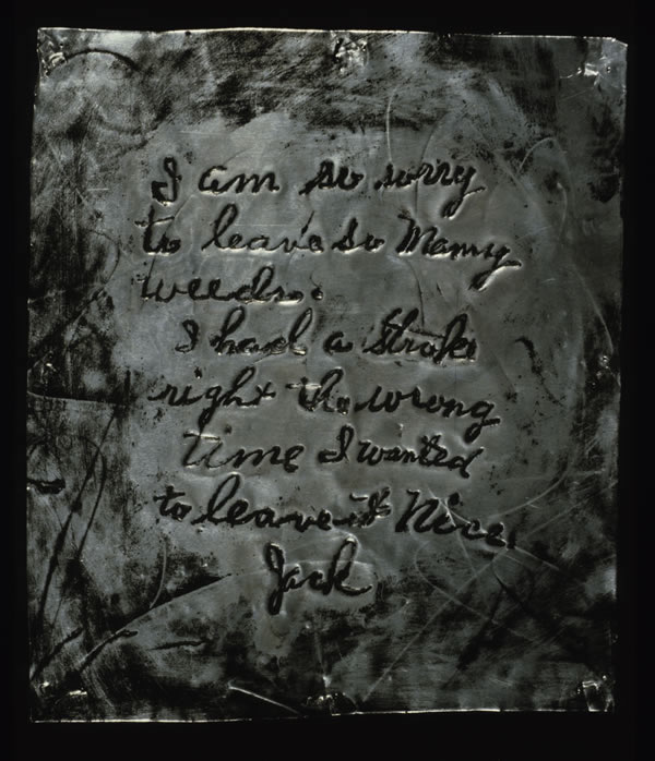 Jack’s Weeds, note found in elderly man’s home, transferred to metal, 11″ x 13″, Cedar Rapids, Iowa, 1984.