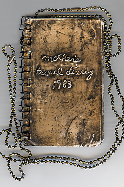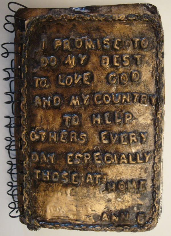 I Promise To Do My Best, from original alphabet pasta craft by Ann Gilmor at age 6, 5″ x 7″, transferred metal, 2002