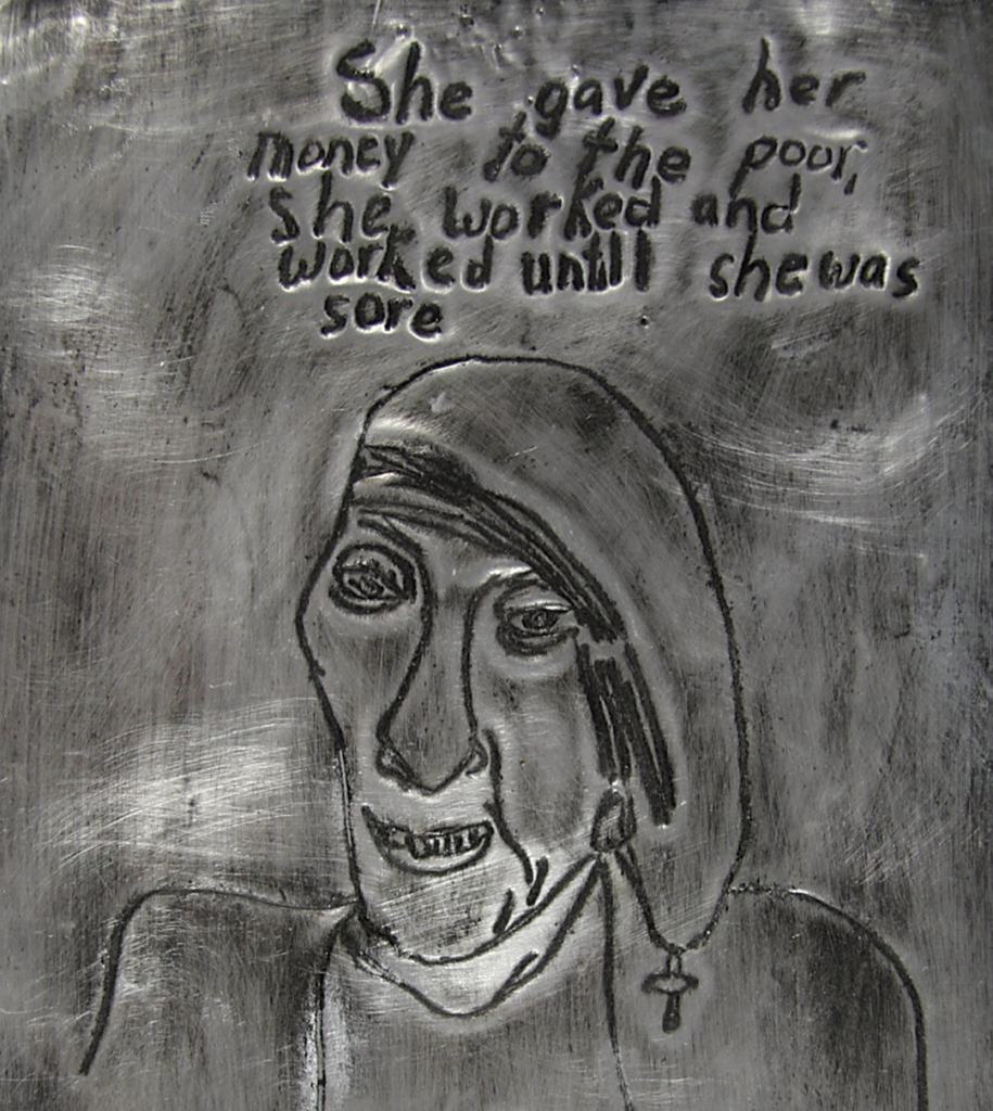 Bed Shoe Home: “The Cracked Ceiling”, remembered place drawing by anonymous participant, embossed aluminum over wood, 12″ sq., 2016.