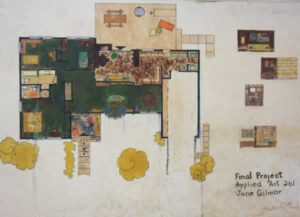 Interior Design I project designing my parents new home interior (they actually used it), 24″ x 36″ ink on board with fabric samples, freshman, Iowa State University, Ames, 1965